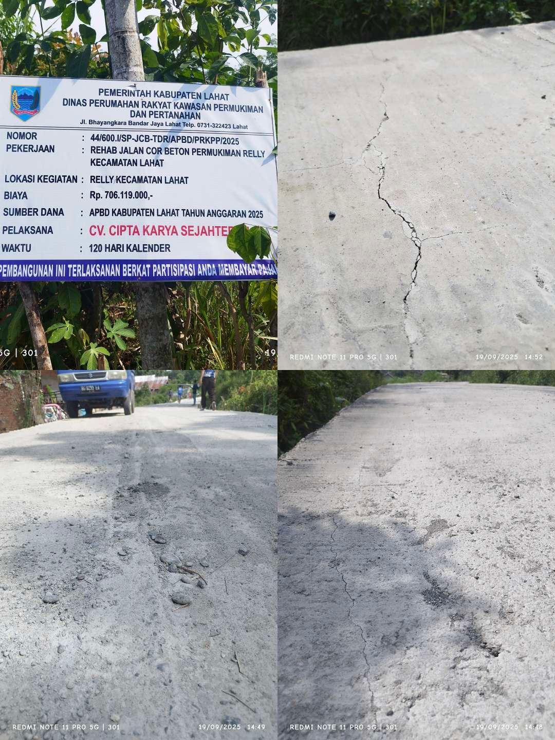 Lahat — Proyek rehabilitasi jalan cor beton di kawasan permukiman Relly, Kecamatan Lahat, kembali menuai sorotan. Proyek senilai Rp 706 juta lebih yang dikerjakan CV. Cipta Karya Sejahtera itu, meski masih terbilang baru, sudah menunjukkan tanda-tanda kerusakan.