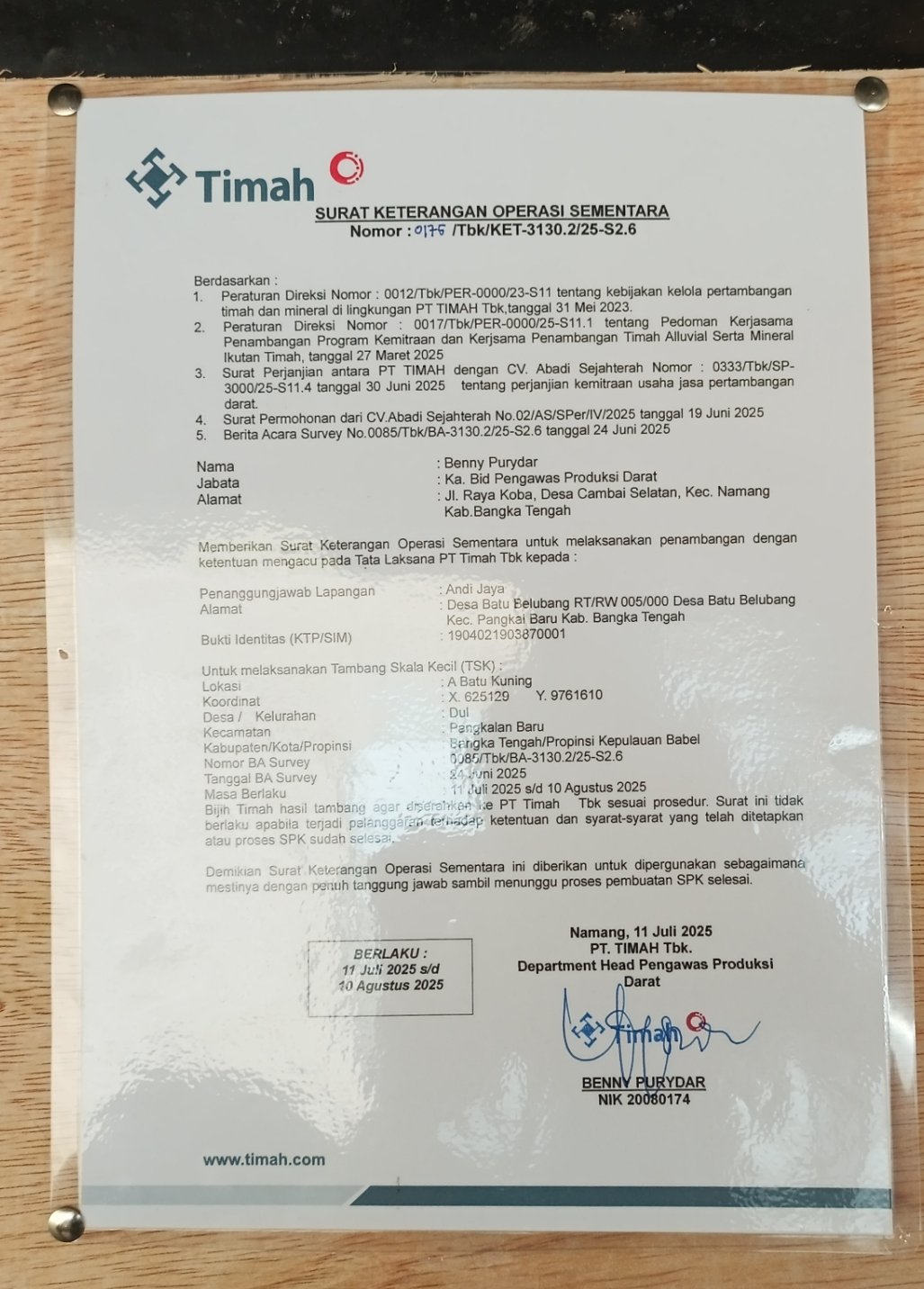 Pada kunjungan yang dilakukan tim redaksi pada Selasa siang (22/07/2025), ditemukan plang resmi yang mencantumkan identitas mitra dan legalitas tambang tersebut, termasuk surat keterangan beroperasi sementara yang dikeluarkan langsung oleh PT Timah. Hal ini menguatkan bahwa kegiatan penambangan yang dilakukan berada dalam koridor hukum yang sah dan bukan merupakan aktivitas tambang liar.