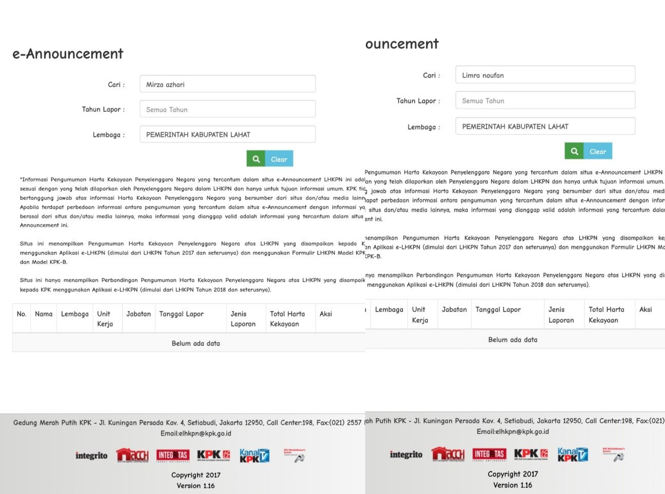 Dalam pencarian melalui laman e-LHKPN KPK (elhkpn.kpk.go.id) per 20 September 2025, tabel informasi atas nama kedua pejabat tersebut hanya menampilkan keterangan “Belum ada data”, yang berarti tidak ada LHKPN yang dipublikasikan.