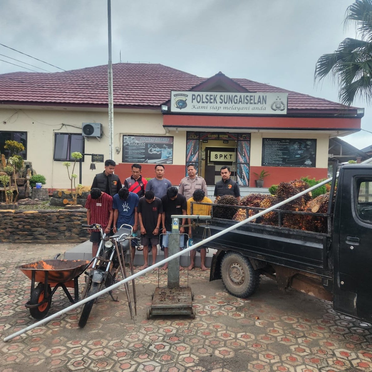 Selain itu, polisi juga menyita sejumlah barang bukti dari lokasi penangkapan, di antaranya satu unit timbangan merek Cahaya Adil, tiga (3) buah loding, satu (1) unit sepeda motor RX King, satu (1) unit mobil merek Gremax, satu (1) egrek, satu (1) arco, dan sekitar 1,2 ton buah kelapa sawit hasil curian.